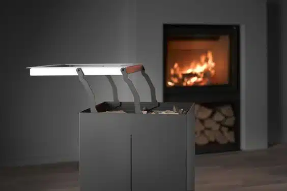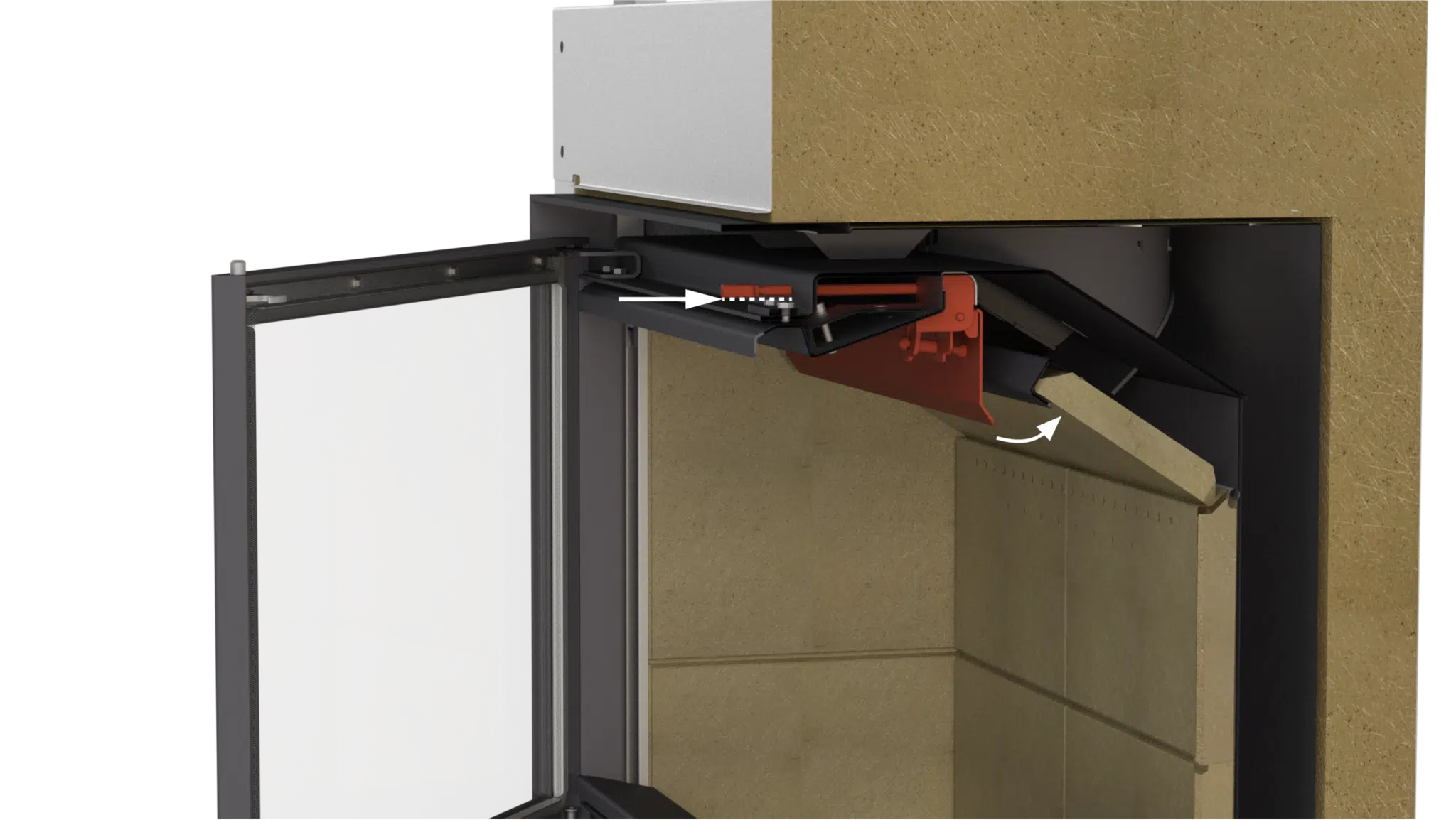 A mobile smoke deflector opens and closes with the door on the Stûv 16. When the door is open, it allows the smoke to escape, thus avoiding backflow into the room, and when the door is closed, the deflector prevents the smoke from being quickly exhausted, thus ensuring a second combustion of the gases in the device.