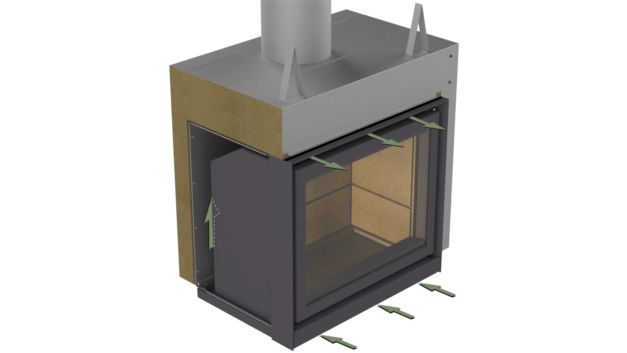 The heat is returned to the room through an opening located between the combustion chamber and the Stûv 16 casing. No fan is required since convection is by natural gravity for these models of wood fireplaces and inserts.