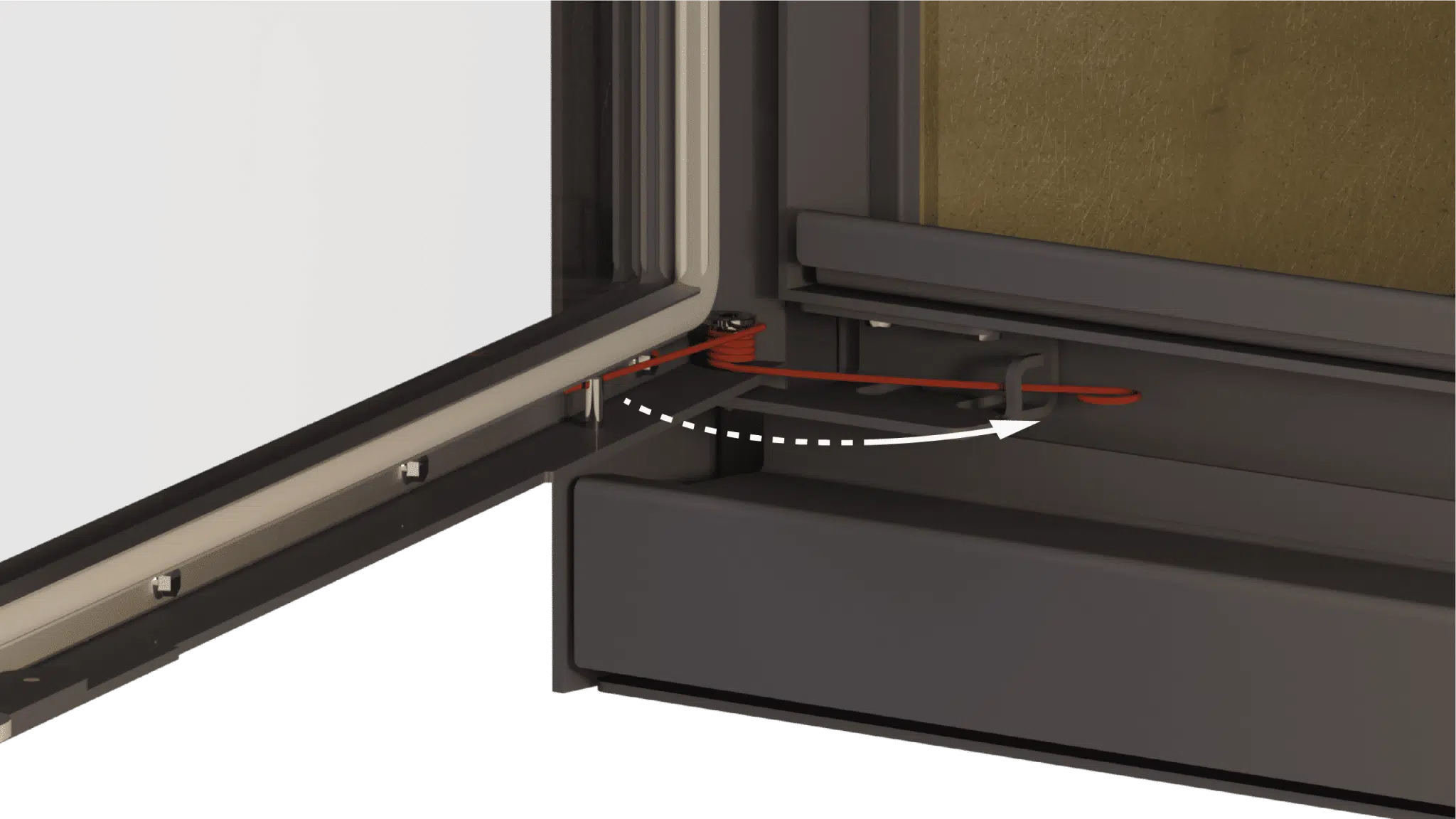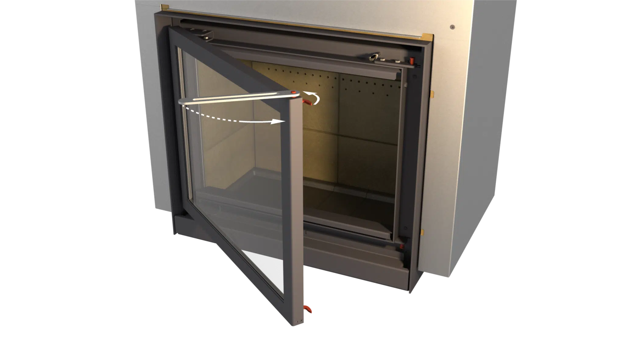 A small spring is positioned at the bottom of the Stûv 16 door to ensure its closure when released. When the door of these models of wood fireplaces and inserts is partially closed, it creates a blowing effect on the flames that is very useful for lighting the fire and prevents sparks or embers from falling to the ground.