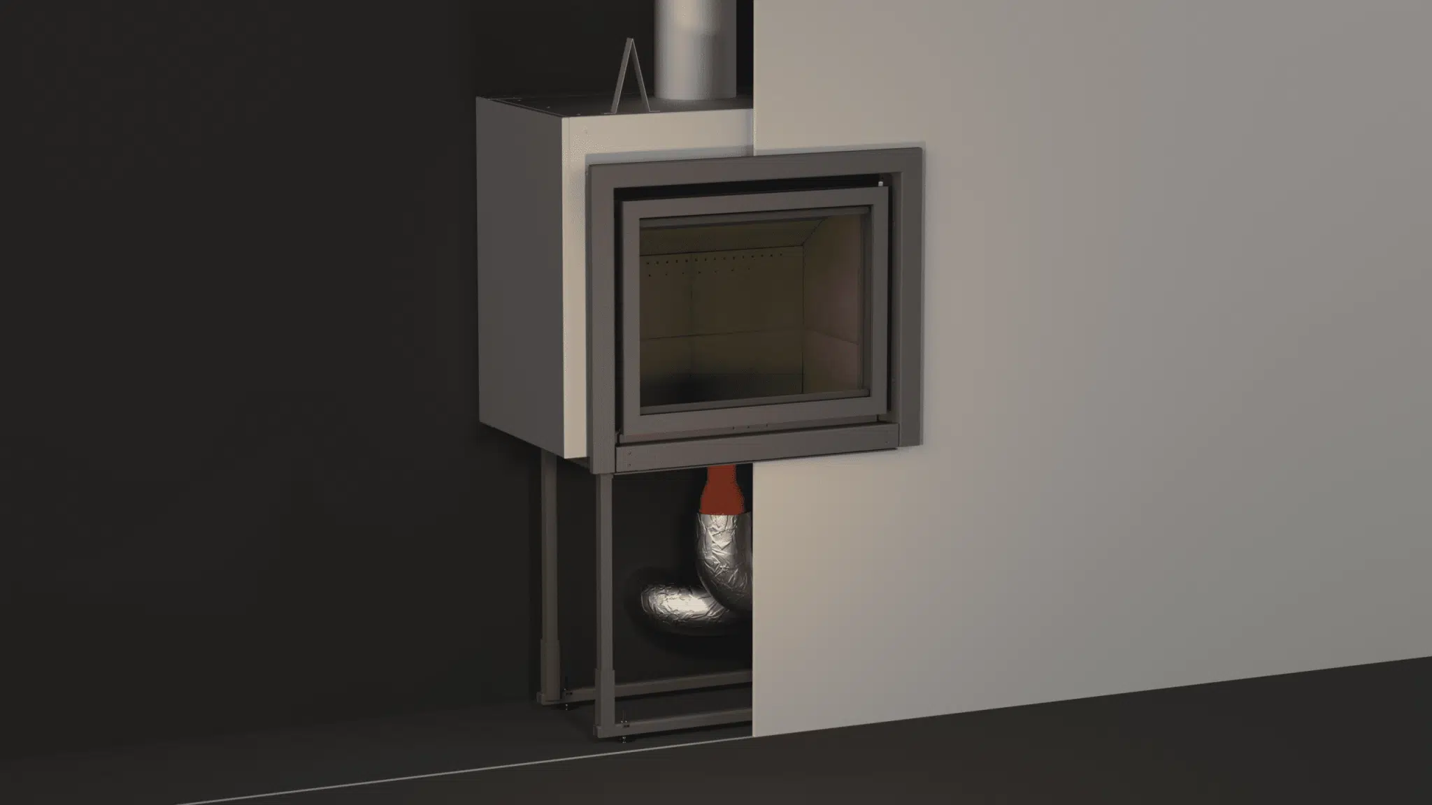 An opening under the device is specially designed to connect an outside air intake directly to the Stûv 16 combustion chamber. The fire then takes oxygen outside the house and thus ensures optimal combustion.