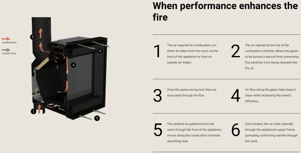 Stûv 6-in inserts offer a breathtaking view of the fire. The Firebox widens toward the front to reach the streamlined door frame. This design, unique to Stûv 6-in, makes it possible to reduce the dimensions of the insert, while making the fire the focus.